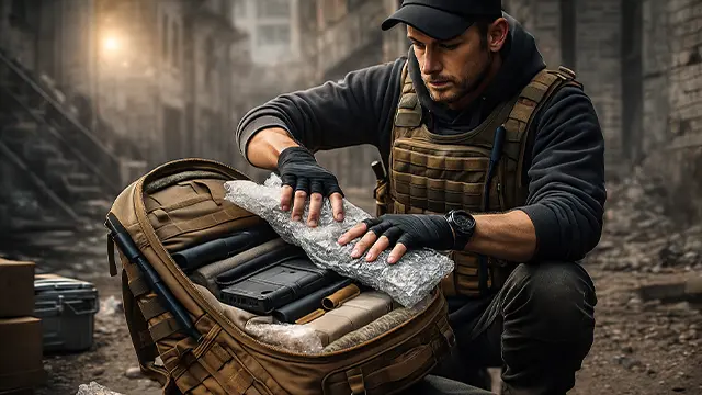 - Coloque os itens mais pesados (ex: água, ferramentas, munições) no fundo da mochila e o mais próximo possível das suas costas.